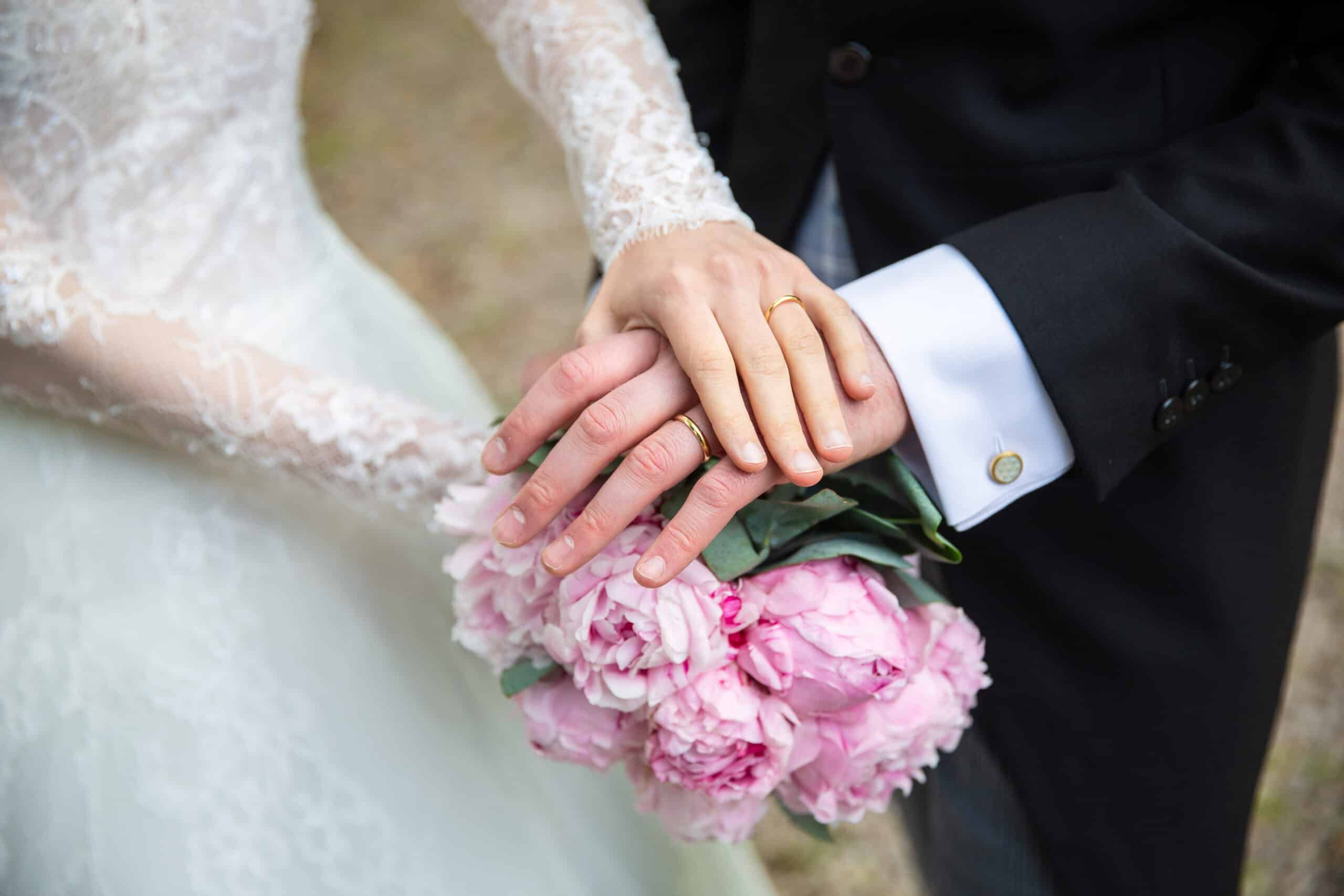 photo de mariage avec bouquet et mains